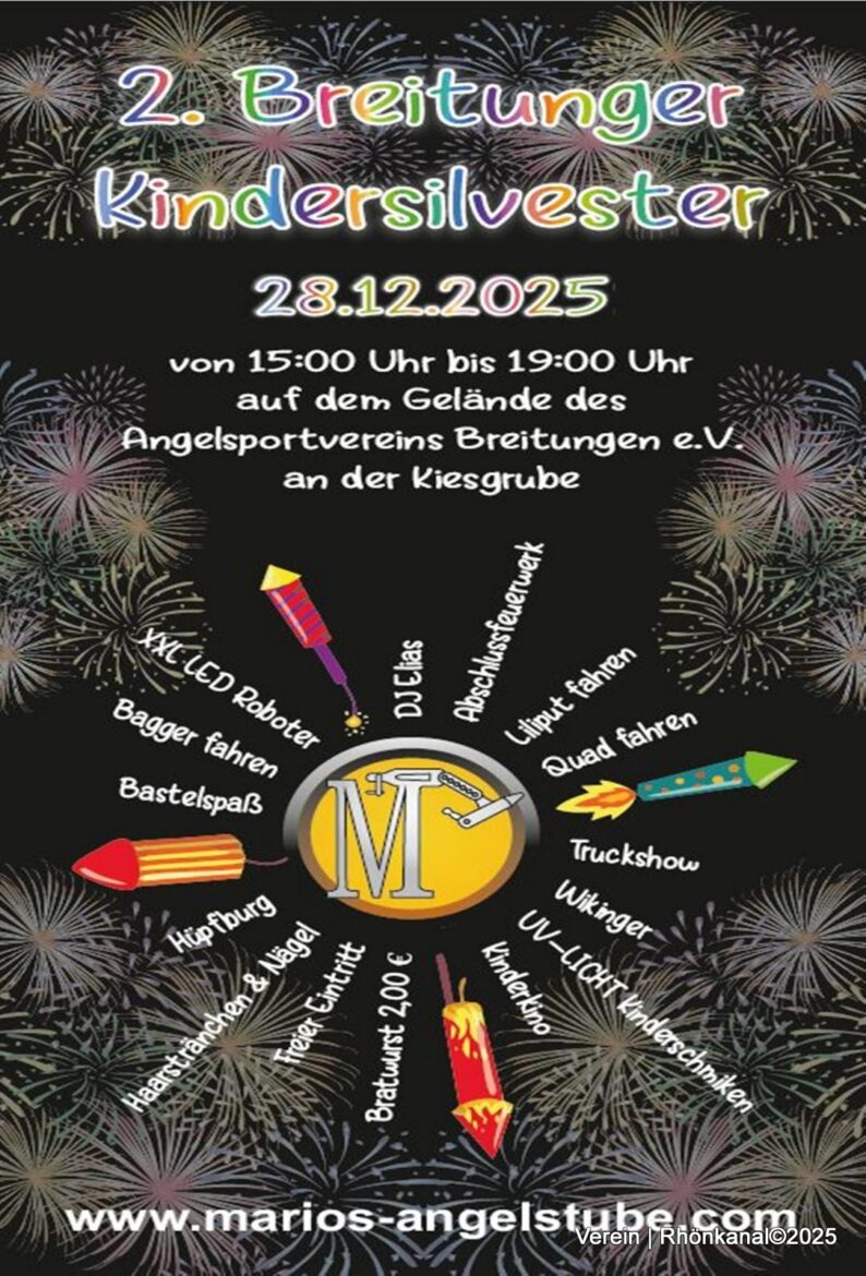 Am Sonntag, den 28. Dezember 2025 geht das Team vom „Pyrospektakel Breitungen“ in die zweite Runde des „Breitunger Kindersilvesters“. „Mit dieser Veranstaltung möchten wir es wieder allen kleinen Kindern, die Silvester um Mitternacht im Bettchen schlafen, ermöglichen eine richtige Silvesterfeier mit abschließendem Kinder-Silvesterfeuerwerk zu erleben“ Im Rahmen der Veranstaltung sind von 15 bis 19 Uhr wieder sehr tolle Attraktionen und Überraschungen geplant. Man darf sich auf Bastelspaß mit Astalapixa Kreativscheune, […]
